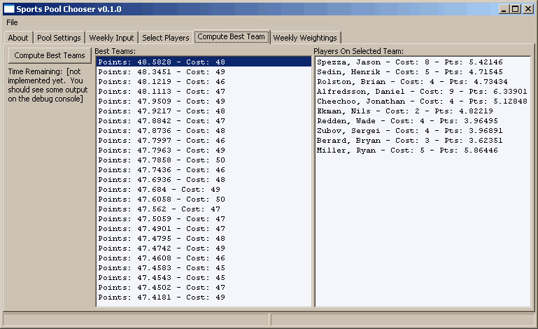 AboutSports Pool Team Chooser is a program that can be used to calculate the best teams to pick in online sports pools. It takes player and team statistics and the limits of the pool (number of players at each position, total player cost) and uses them to find the combination of players that is most likely to give you the most points in the coming week.When this re-write is done, this will be v4.0. This one is in C++; the old ones were in VB6.0. [Note: I may discontinue this project and simply redo it as a web application -- the development speed would be faster, and it could also be a better business model...] ![]() Sportsnet.ca T-shirt won using the program This is actually the 4th such program I have created, but the other ones were geared specifically towards a certain hockey pool and were called Hockey Pool Team Chooser, while this new version is much more customizable and can be used for many types of pools. This program is written in C++ and uses wxWidgets and wxGlade for the GUI. wxWidgets is a cross-platform GUI framework, allowing me to create both Windows and Linux versions of this program without much extra work. Rather than just calculating [average pool points per game]×[games this week] to find the best players, the program can take into account the player's recent performance and will eventually be able to take into account the difficulty of the teams he'll be playing against in the coming week. Current Features: